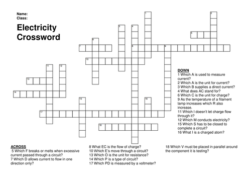 Electricity Crossword Puzzles - The kid's puzzles almost always have 18 words, while the adult's puzzles may have over 50.. The crossword solver found 200 answers to the energy crossword clue. You may leave fields blank for less than 20. Enter up to 20 items. Enter the answer length or the answer pattern to get better results. Write your crossword entry on the left & the associated clue on the right.